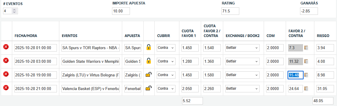 No se cuales hayan sido las cuotas reales del ejemplo mostrado, pero la cuota mínima debe ser 1.80 por línea. Siempre que las cuotas tiendan a ser más altas, el rating será más bajo y por ende menos chances que sea rentable.